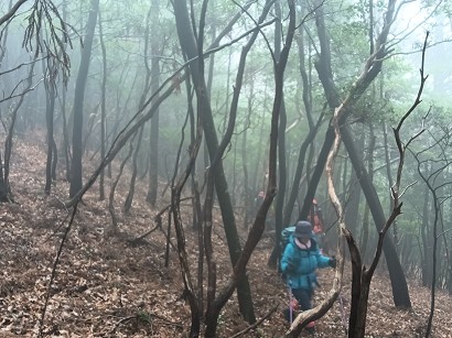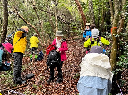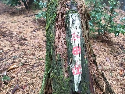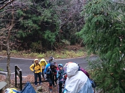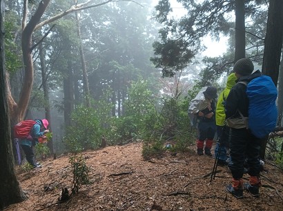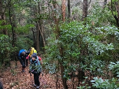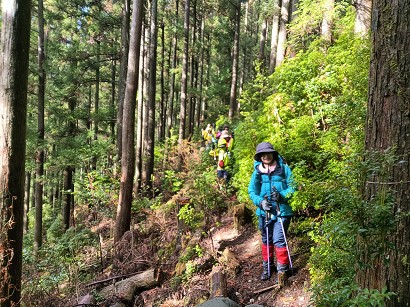 きわどいトラバースに濡れた落ち葉道で注意が必要です |