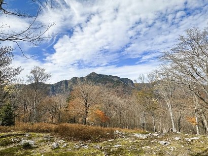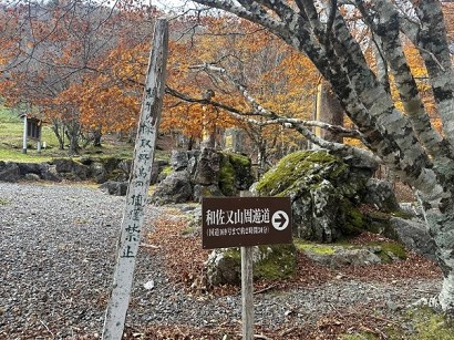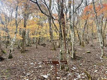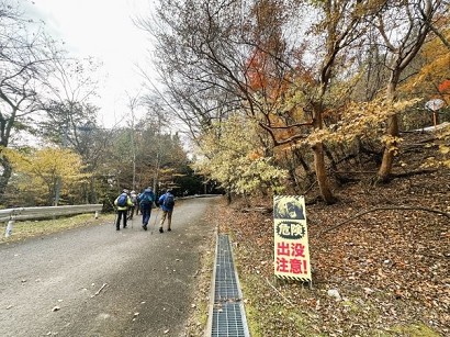 熊出没注意の看板を横目に見ながら少し雲空の中をスタートしました |