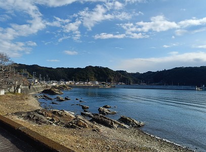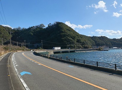 山中の景色と海岸線の景色を眺めながら、串本町の市街地を目指します。